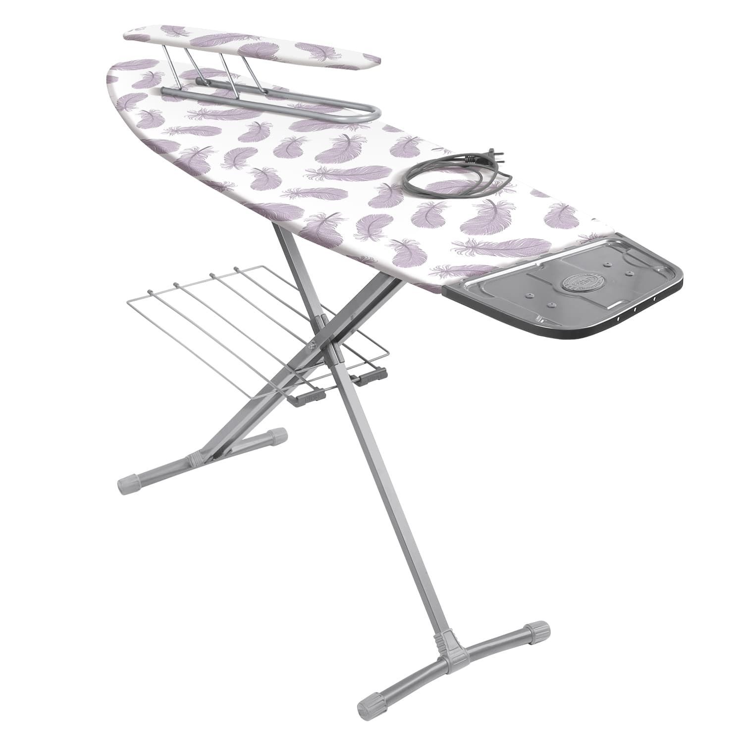 Гладильная поверхность -фанера (1225х400мм) плавно регулируемая высота до 90см, EUROподставка под утюг с термосиликоном, переносной подрукавник, электросоединитель 1,6м, розетка, полка для белья, материал чехла-хлопок, max нагрузка на глад.поверхность 25кг, вес изделия-8,4кг. Индивидуальная термоупаковка.