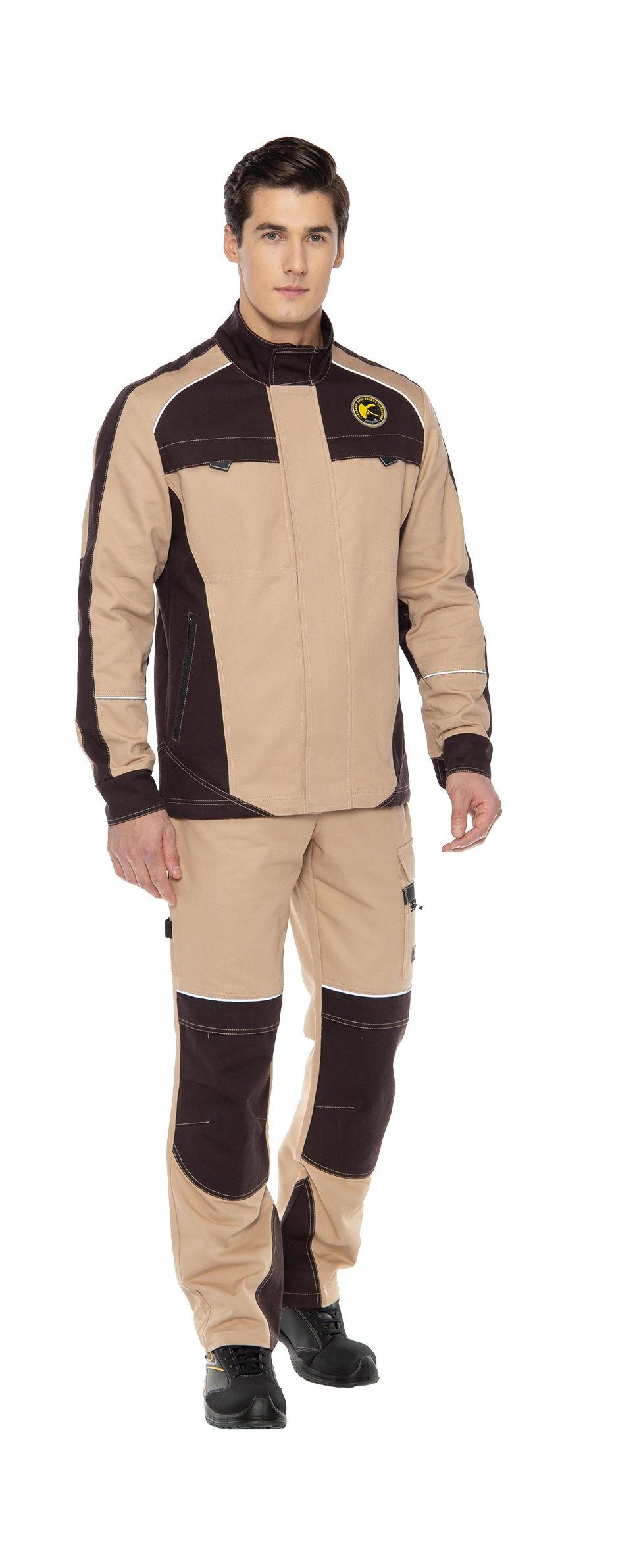 Цвет: бежевый-коричневый Материалы: Мастер-универсал С25 (100% хлопок), 250 г/м², ВО. Мягкая и комфортная ткань из хлопка высокого качества. Куртка полуприлегающего силуэта с застежкой на молнию под планкой на липучках. Нагрудные карманы под кокеткой. Нижние карманы на молнии с отделкой из стропы. Спинка с кокеткой и вертикальными рельефами. Воротник - стойка. Объем куртки регулируется по низу потайной кулисой. Рукава втачные с манжетами на кнопке. Вентиляционные отверстия под проймой. Брюки эргономичной формы с застежкой на молнию