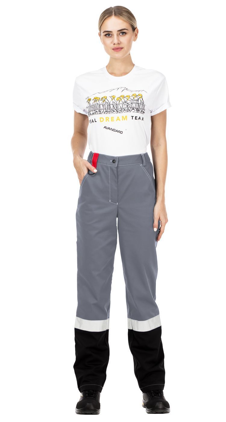 Брюки с застежкой на гульфик с молнией, с поясом со шлевками. На поясе эластичные вставки по бокам для регулировки объема. На передних половинках верхние карманы с боковым входом. На задних половинках верхние накладные карманы с объемом в нижней части и карманы для инструментов.