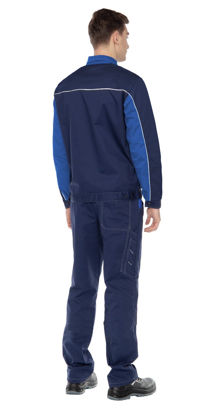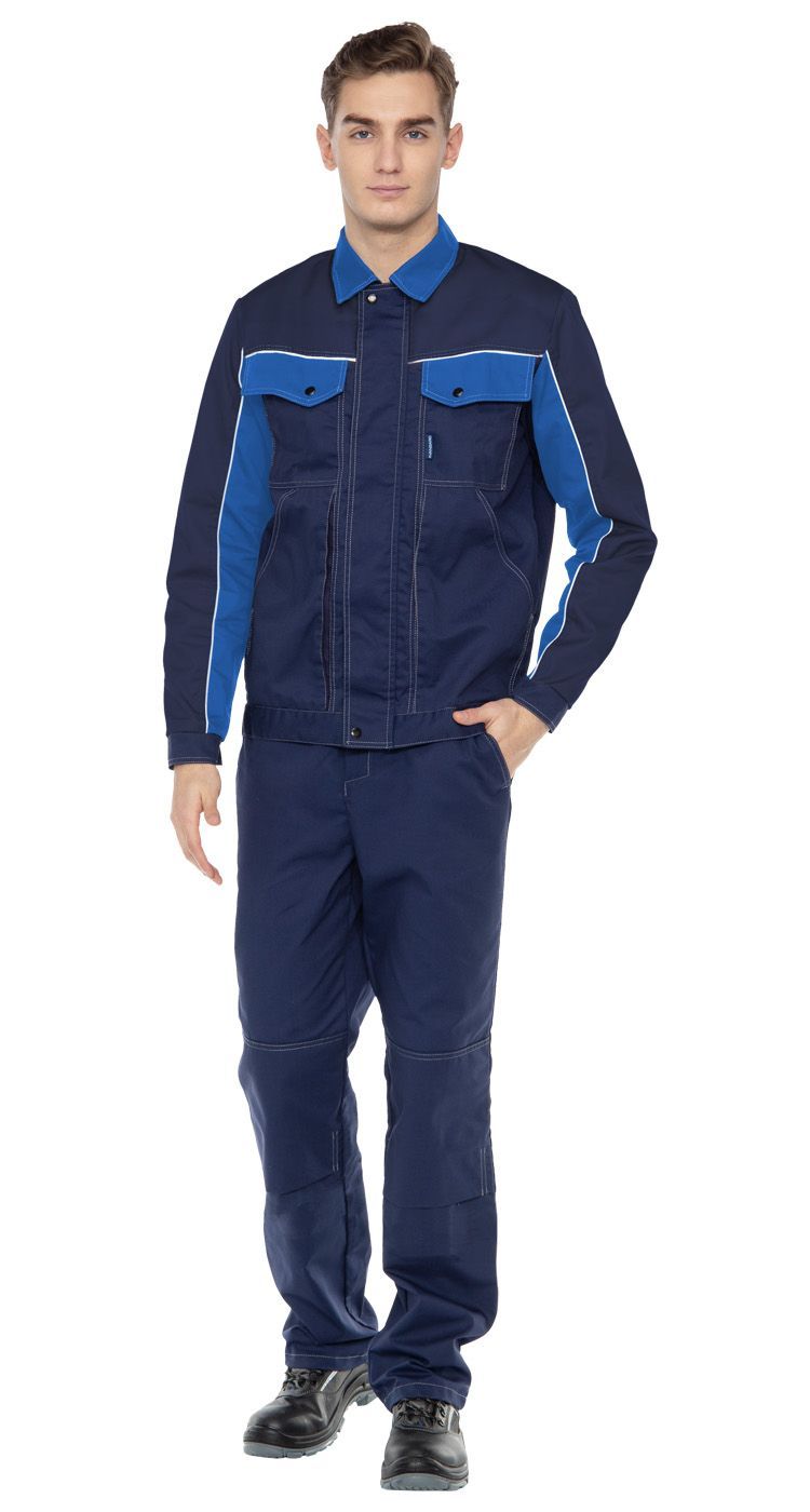 Рабочий мужской костюм состоит из куртки и брюк. Он выполнен из плотной ткани с высоким содержанием хлопка.
