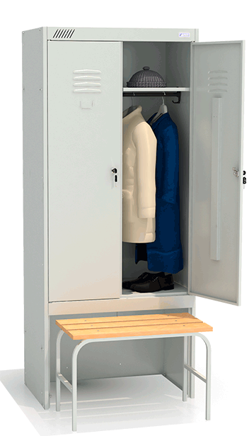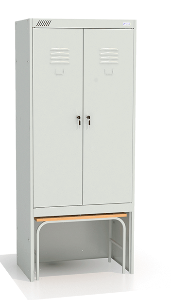 2 секции, 2 двери, ниша под выдвижную скамью. 2 полки,4 крючка, 2 перекладины, 2 замка повышенной секретности, корпус и двери окрашены порошковой краской RAL 7035 СКАМЬЯ В СТОИМОСТЬ НЕ ВХОДИТ, ЗАКАЗЫВАЕТСЯ ДОПОЛНИТЕЛЬНО