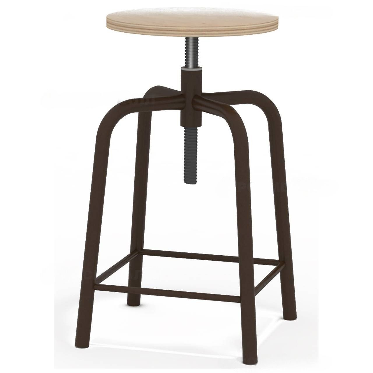 Сиденье табурета рабочего изготовлено из фанеры 18 мм, диаметр 300 мм, покрыто бесцветным лаком. Высота сиденья регулируется винтовым механизмом (500-680 мм). Основание изготовлено из трубы круглого сечения, покрыто порошковой полимерной краской.