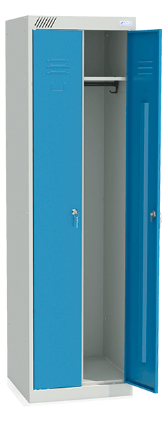 2 секции, 2 двери, 2 полки, 4 крючка, 2 перекладины, 2 повышенной секретности замка с прямым язычком, корпус- RAL 7035, двери -RAL 5015